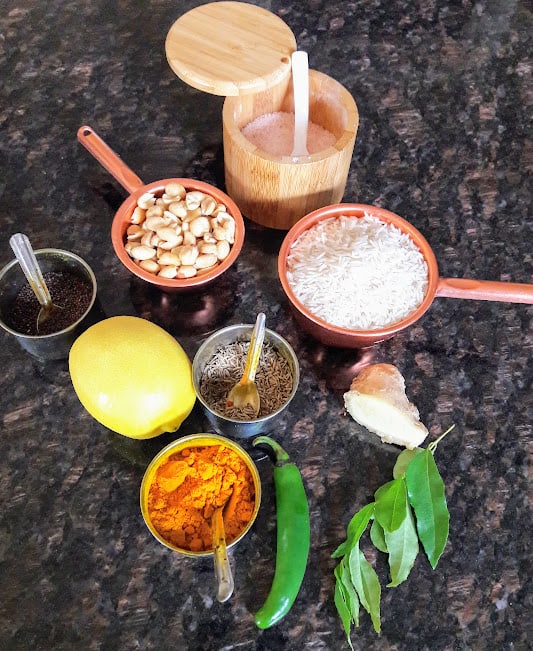 - Fresh Ingredients : Green chili pepper, fresh ginger root, fresh lemon juice and cilantro leaves for garnish. If you can easily find fresh curry leaves, do use them for intense earthy aroma. If not easily available, you can skip or use bay leaves
