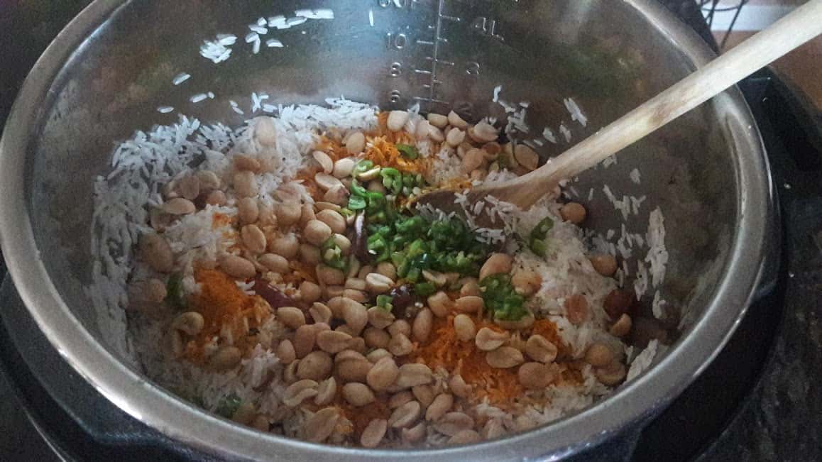 - Rinse and wash rice grains and drain them well. Start the instant pot in SAUTE mode and heat it. Add oil. Add curry leaves, mustard and cumin seeds, hing (if using) and green chili. Curry leaves will sputter some. Sauté them for a minute. Add peanuts, ginger and turmeric and sauté them well.