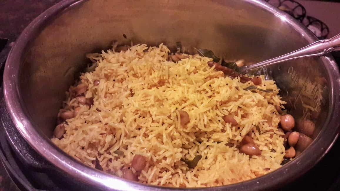 - Rinse and wash rice grains and drain them well. Heat oil in a large pot on medium heat. Add curry leaves, mustard and cumin seeds ,hing( if using) and green chili. Curry leaves will sputter some. Sauté them for a minute. Add peanuts, ginger and turmeric and sauté them well.